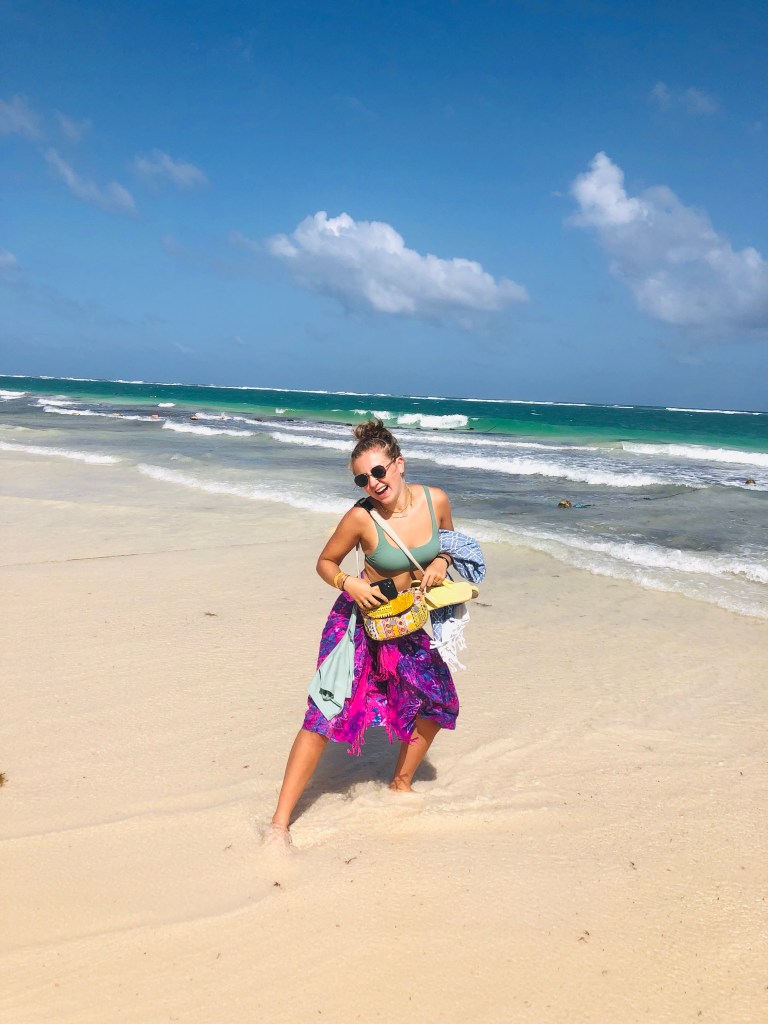 Na de stevige lunch vervolgenden we onze fietstocht naar de kust. We hadden het fietsen in Tulum inmiddels goed onder de knie en ook voor het oversteken een tactiek ontwikkeld: lief lachen en gaan. De Mexicaanse mannen zijn namelijk nogal fan van ons en uiten dit naast het schaamteloos staren, eindeloos “hola chickas” zeggen en stiekem foto’s maken dus tevens in voorrang verlenen. Vandaag mochten we wel verder richting het strand en we besloten meteen door te fietsen naar de Maya ruïnes. Maar helaas pindakaas, dommage pindafromage, super sad peanutspread (ik ben nog zoekende naar eens Spaanse versie, suggesties zijn welkom in de reacties), de ruïnes waren niet toegankelijk (vanwege de orkaan) dus zonder er ook maar iets van te hebben gezien paaiden we weer af. Onze treur was echter van korte duur, want toen we naar het strand liepen belandden we werkelijk in het paradijs. Zoals een oud Mexicaans gezegde luidt: “hagelwit zand, azuurblauwe zee, palmbomen, zon en een mens is tevree.”
