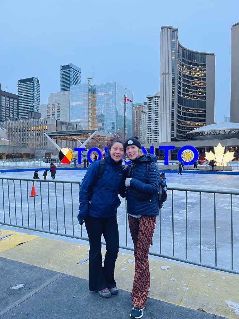 Het is tijd voor mijn eerste blogje, vanuit de heuvels bij Villa de Leyva. Afgelopen zaterdag was het zo ver, ons vertrek naar Latam! (De hippe term voor Latijns-Amerika, hebben we begrepen van Manuel). Het vertrek ging niet zonder slag of stoot: direct na het afscheid bleek dat we een bewijs moesten hebben dat we Colombia weer gaan verlaten. Gelukkig bestaan er websites waar je een nepreservering maakt, dus dat was zo opgelost. We vlogen via Toronto en daar hadden we een overstap van acht uur, de uitgelezen kans om downtown te bekijken (hoewel een mevrouw met ongevraagd advies daar anders over dacht: ‘The city can be big and confusing, many people miss their flights!’) Dit goedbedoelde Canadese advies sloegen we natuurlijk beleefd in de wind en even later zaten we in de trein naar Union Station. Bibberend hebben we een rondje door Downtown gelopen en een Maple Mocha gedronken om de ijspegels aan onze lippen te ontdooien. Daarna was het tijd voor een burger onder het genot van live-muziek, al was het Bikinibroek gehalte wel erg hoog ingesteld op de synthesizer. Terwijl we terugliepen naar het station begon het te sneeuwen wat mij nog gelukkiger maakte en Jin nog kouder maakte (had nou maar een donsjas meegenomen!)