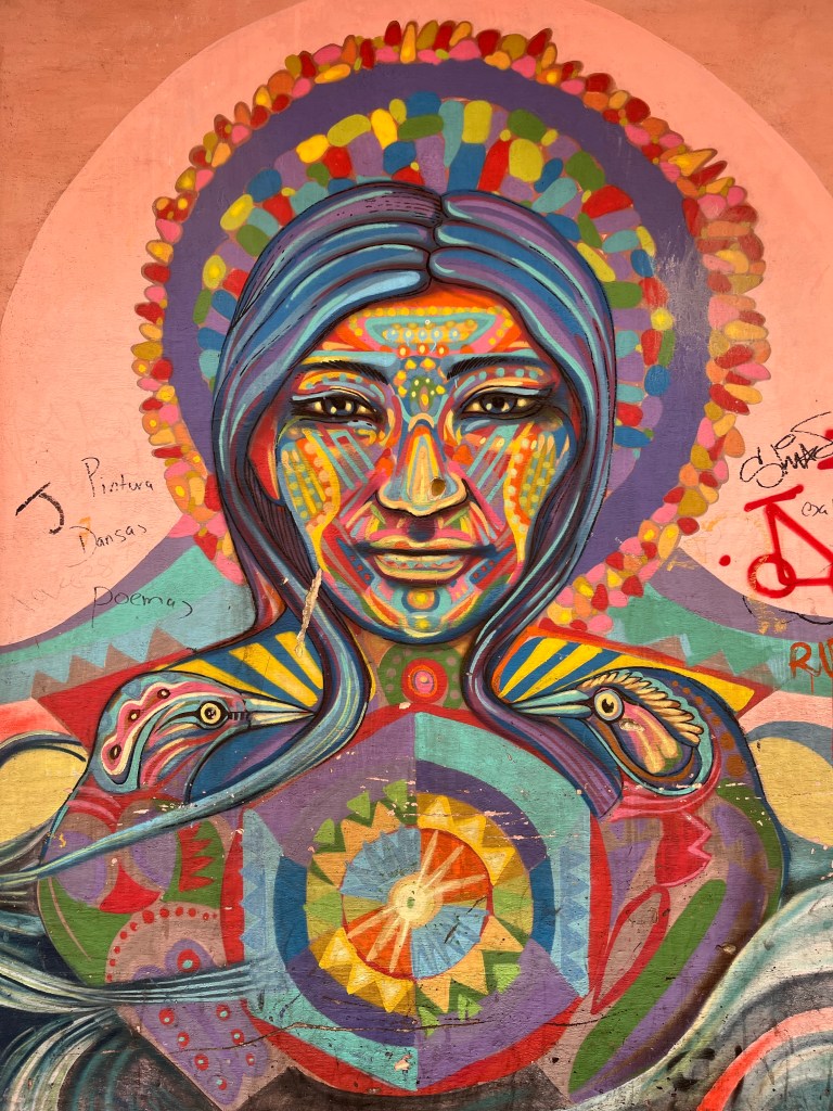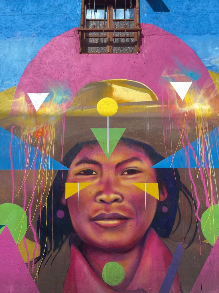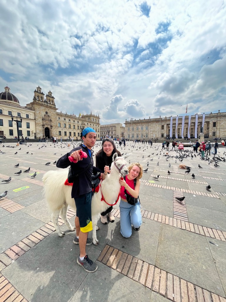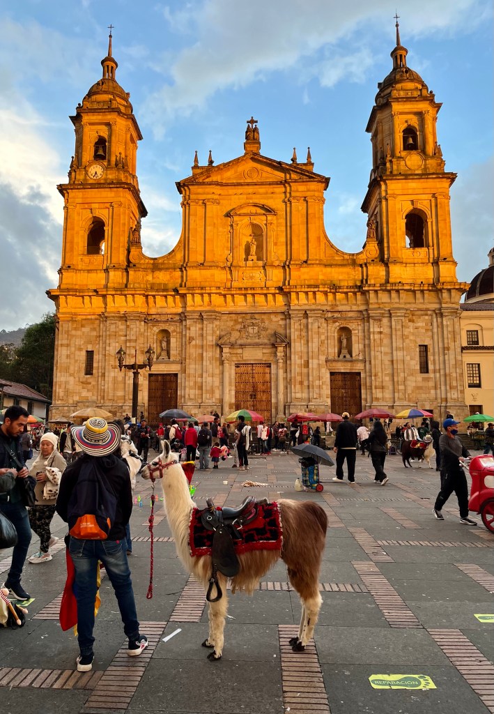 Die middag hebben we wat rondgewandeld en een simkaartje (zodat we kunnen Uberen, taxi’s hier kunnen een beetje shady zijn) en cash geregeld. La Candelaria is erg kleurrijk, een tikkeltje chaotisch en ook vrij toeristisch. Op het Plaza Bolívar zagen we de eerste lama’s, hebben we wat bananen chipjes gehaald en de kathedraal bewonderd in de ondergaande zon. In ons beste Spaans bestelden we wat arepas (maïspannenkoeken met kaas) en bananenkoekjes, helaas werden we vooral uitgelachen. Na dit debacle hakte de jetlag er voldoende in om voor de tweede keer vandaag op stok te gaan.
