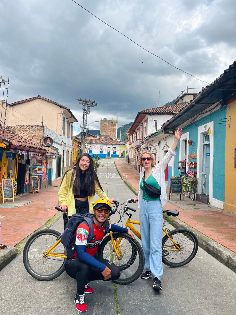 Omdat Bogotá enorm is hadden we wat tour-keuzestress (foodtour, graffititour, fietstour, tour door Ciudad Bolívar, walking tour, help?!) maar we besloten dinsdag met een fietstour te starten. Dit bleek een geweldige keuze! Ten eerste bestond de hele groep uit Jin en mij, ten tweede waren Luiz en Francisco onze gidsen en we hebben ons echt dood gelachen met hen. Het fietsen door Bogotá was erg leuk, we hebben veel verschillende wijken in de stad gezien en ook veel geleerd over de geschiedenis en het heden (zoals over het systeem dat wijken een soort ‘welvaartscijfer’ geeft wat bepaald in welke mate ze meer/minder betalen voor GWL). Na afloop zijn we nog met Luiz en Francisco gaan lunchen en hebben we onder andere capibara gegeten (hield een beetje het midden tussen kip en varken). ‘s Middags hebben we er nog een graffititour achteraan geknald, maar dat bleek (in combinatie met de hyperactieve gids) wat veel van het goede. Hoe dan ook, de plaatjes waren mooi en we hebben chicha (drank van maïs) en coca-thee (spreekt voor zich) geproefd.