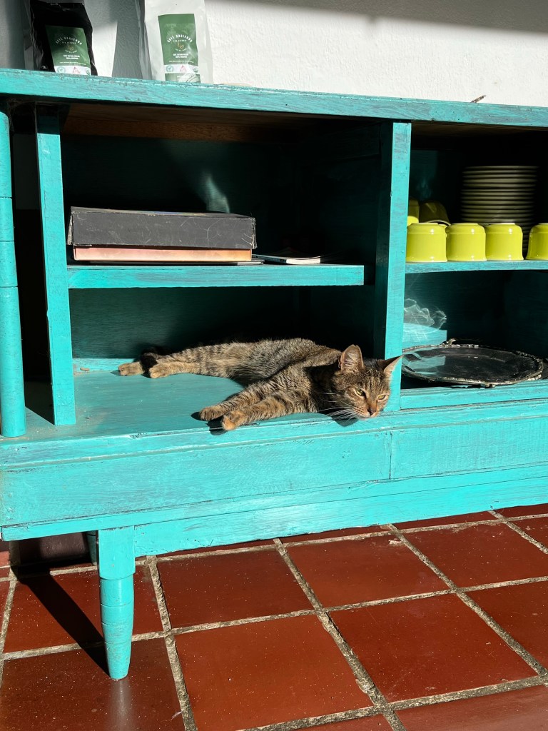 Het voordeel van aankomen in het donker, is de verrassing in de ochtend. En in wát een paradijs waren we nu weer beland! We verbleven op een oude boerderij, omgeven door biologische koffieplantages en palmbomen, met uitzicht op de heuvels en in de verte San Gil. In een paar bomen was een grote hangmat gemaakt met uitzicht op het westen, en terwijl ik daar een boekje aan het lezen was zetten Jane en Felipe (de geweldig lieve eigenaren) het ontbijt klaar: verse broodjes, koffie, fruitsap, ananas, ei, chocolademelk, kaasjes, jam…