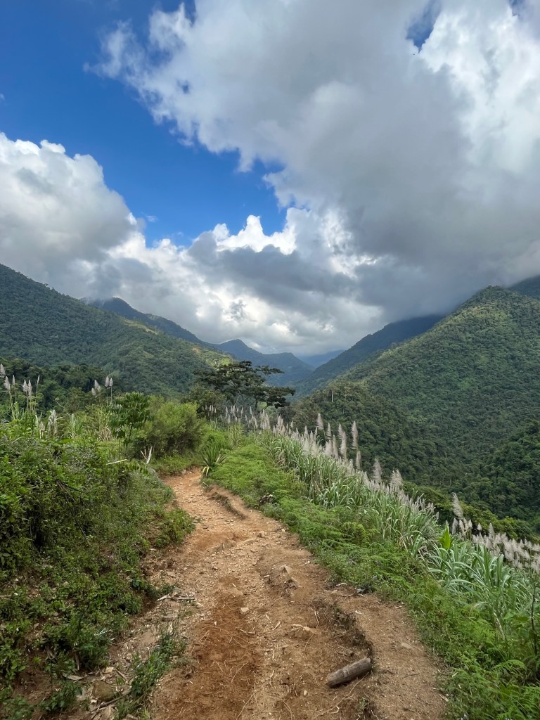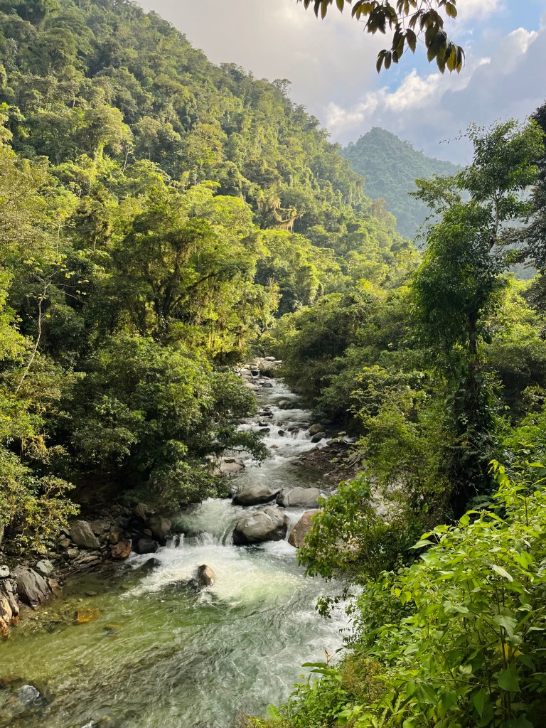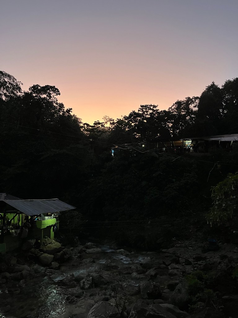 We worden om 9 uur opgehaald in Palomino en rijden naar La Aguacatera, het verzamelpunt voor de tocht. Onze groep blijkt te bestaan uit Jin, mij, een Fransman (die zoals het hem betaamt letterlijk geen woord Engels spreekt), onze gids Ender en vertaalster Eliana. Eerst rijden we nog ongeveer 1,5 uur in een 4X4 de heuvels in, (waar we nog even ANWB’tje spelen bij een vastgelopen bus) en niet veel later komen we aan in El Mamey, waar de hike echt zal beginnen. De eerste kilometers zijn allemaal in de brandende zon en lopen recht omhoog, dus de toon is meteen gezet. Het uitzicht over de heuvels (en in de verte de zee) is erg mooi maar het pad zelf is nog vrij breed en niet super interessant. Bezweet komen we na de laatste kilometers aan bij de hut, waar we ons lekker kunnen opfrissen in een riviertje en een volledige muggenfamilie zich te goed doet aan mijn bloed. Weinig geslapen, want ooooh wat een jeuk!!