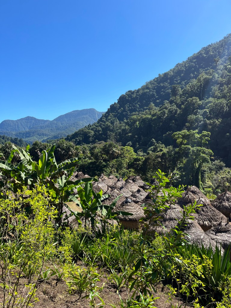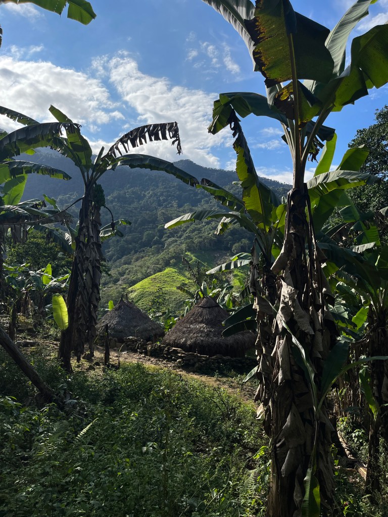 Na de suboptimale nacht wacht een suboptimaal ontbijt op ons, arepas gaan er ‘s ochtends niet al te best in. Om 6:00 vertrekken we dus het is nog lekker koel. Bij een van de fruitstops onderweg wordt Jin herkend door iemand uit Groningen, en ik geniet van de zijlijn terwijl ze probeert te verbloemen dat ze geen idee heeft wie haar herkent. Rond 9:00 krijgen we van Manuel uitleg over de cultuur van de Kogui (foto’s met toestemming). Ciudad Perdida en het gebied daaromheen is namelijk hun thuis en daarom is het belangrijk dat iedereen wat meekrijgt over hun leefwijze en gebruiken. Het zou een erg lang verhaal worden als ik alles samenvat, maar in het kort is het een traditionele manier van leven waarbij veel ruimte is voor meditatie en de natuur. Als we verder lopen komen we langs een aantal Kogui dorpen en zien we de aantal gebruiken waar Manuel over vertelde, erg bijzonder om te zien maar ik voel me ook een beetje een indringer..