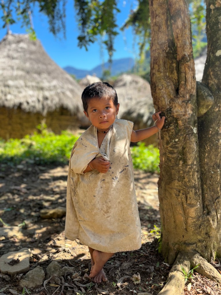 Na de suboptimale nacht wacht een suboptimaal ontbijt op ons, arepas gaan er ‘s ochtends niet al te best in. Om 6:00 vertrekken we dus het is nog lekker koel. Bij een van de fruitstops onderweg wordt Jin herkend door iemand uit Groningen, en ik geniet van de zijlijn terwijl ze probeert te verbloemen dat ze geen idee heeft wie haar herkent. Rond 9:00 krijgen we van Manuel uitleg over de cultuur van de Kogui (foto’s met toestemming). Ciudad Perdida en het gebied daaromheen is namelijk hun thuis en daarom is het belangrijk dat iedereen wat meekrijgt over hun leefwijze en gebruiken. Het zou een erg lang verhaal worden als ik alles samenvat, maar in het kort is het een traditionele manier van leven waarbij veel ruimte is voor meditatie en de natuur. Als we verder lopen komen we langs een aantal Kogui dorpen en zien we de aantal gebruiken waar Manuel over vertelde, erg bijzonder om te zien maar ik voel me ook een beetje een indringer..