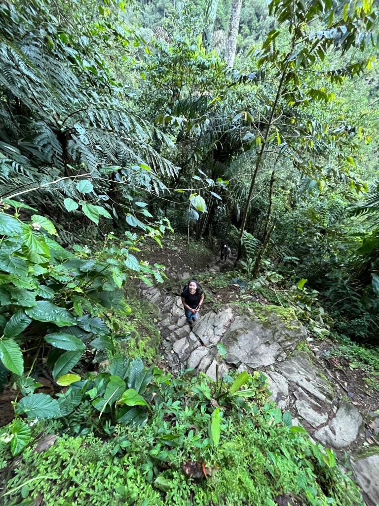 Na wederom een nacht vol jeuk (en ditmaal ook kou) wachten er weer arepas en knakworstjes op ons als ontbijt, ongelukkiger krijg je Jin niet. Maar vandaag is de grote dag, dus ondanks dat het 5:00 is springen we uit bed en beginnen we aan de laatste kilometers naar Ciudad Perdida! We lopen een mooi stuk langs de rivier en steken die in een klein kabelkarretje over (het leek onze gids wel wat om de rivier gewoon te doorkruisen, maar onze vertaalster -en wij- zagen natte schoenen voor de resterende dagen niet echt zitten). Daarna was het tijd voor de 1200 traptreden naar Ciudad Perdida, een adembenemend pad dat zo in een film terecht kan. Eenmaal boven neemt Ender ons mee langs alle terrazas en vertelt over de verschillende wijken die er vroeger waren. Het is echt heel erg mooi en sprookjesachtig om te zien, en waanzinnig als je bedenkt hoe oud dit is en hoe het ooit gebouwd kan zijn! (Volgens de overlevering via telekinase, dat maakt het natuurlijk wel een stukje makkelijker.) Terwijl de jungle om ons heen ontwaakt voorziet de zon Ciudad Perdida langzaam van een gouden randje. De vreugde is helemaal compleet wanneer Ender opeens met een plateau vol fruit en snacks komt aanlopen!