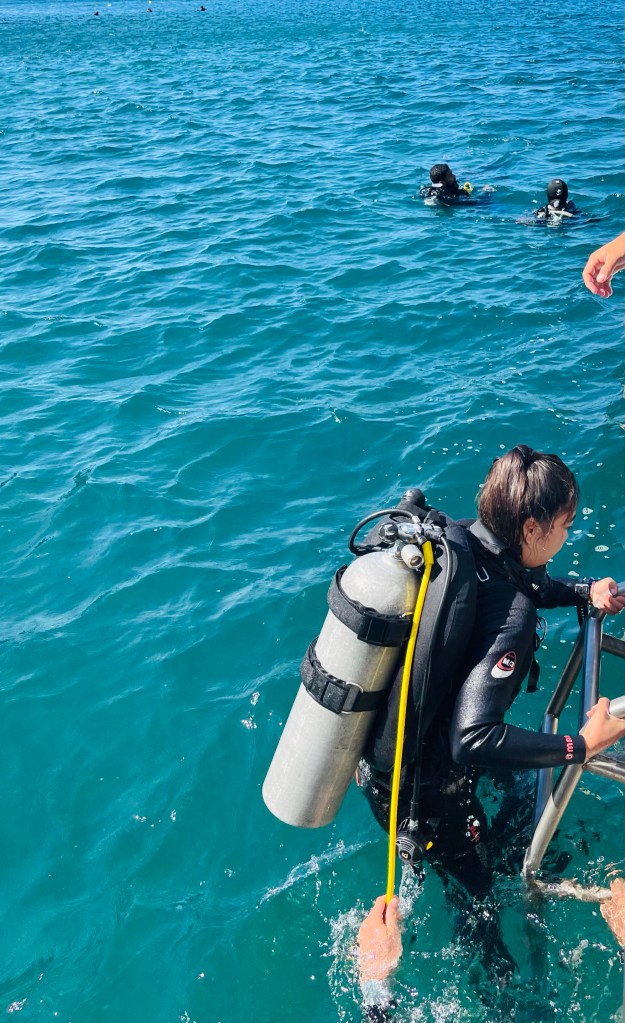 Op dag twee waren de deep- en currentduik aan de beurt Tijdens de eerste duik zijn we afgedaald tot 30 meter diepte. Cata had een flesje met lucht (gevuld op zeeniveau) meegenomen om ons te laten zien hoe het volume hiervan afnam bij deze hoge druk. Daarnaast zie je kleuren niet meer goed op 30m diepte, dus bekeken we een palet wat we bovenwater op nieuw mochten bekijken. We deden ook nog een oefening waarbij je reactievermogen getest werd (ik was op 30m diepte sneller dan op zeeniveau haha) en lieten een ei imploderen, dat daarna direct werd opgesmikkeld door visjes. We deden nog wat van dit soort proefjes en gingen weer langzaam naar boven. De laatste duik was misschien wel de leukste, want dit was de currentduik! We daalden af en lieten ons 45 minuten lang meenemen door de stroming, net een onderwaterachtbaan! We dreven langs de koralen en visjes en de boot kwam ons verderop oppikken. Super grappig om een keer te doen, wel koud omdat je bijna niet zwemt!