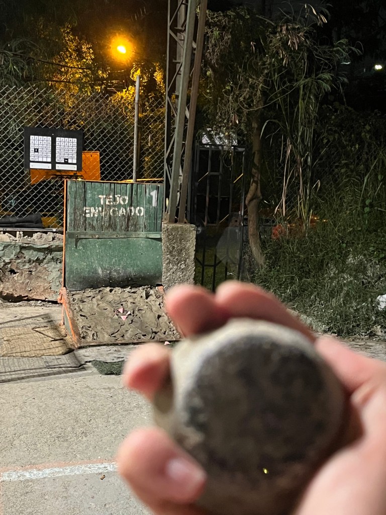Daarna was het tijd voor de salsales en hier zal ik niet al te veel woorden aan vuil maken… Na mijn salsadebacle in Mexico had ik ons braaf opgegeven voor de beginnersles, maar deze bleek wel heeeeel beginner. Ik dacht dat ik incapabel en stijf was, maar och de danspartners hebben me ruim overtroffen. We hebben deze week echter nog met een andere Colombiaanse sport kennis gemaakt: tejo! (zeg: tègo). Tejo is de nationale sport en het is een soort jeux de boules met ontploffingen: je hebt een berg met klei, hier ligt een ijzeren ring op en vier zakjes met buskruit. Je gaat op zo’n tien meter afstand staan en probeert punten te scoren door met je tejo, een steen, 1) zo dicht mogelijk bij de ring te gooien, 2) in de ring te gooien, 3) een ontploffing te veroorzaken of 4) een combi van 1, 2 en 3 te gooien. Het is vast niet lastig om je voor te stellen dat dit een hilarische avond was, ik heb er erg van genoten!